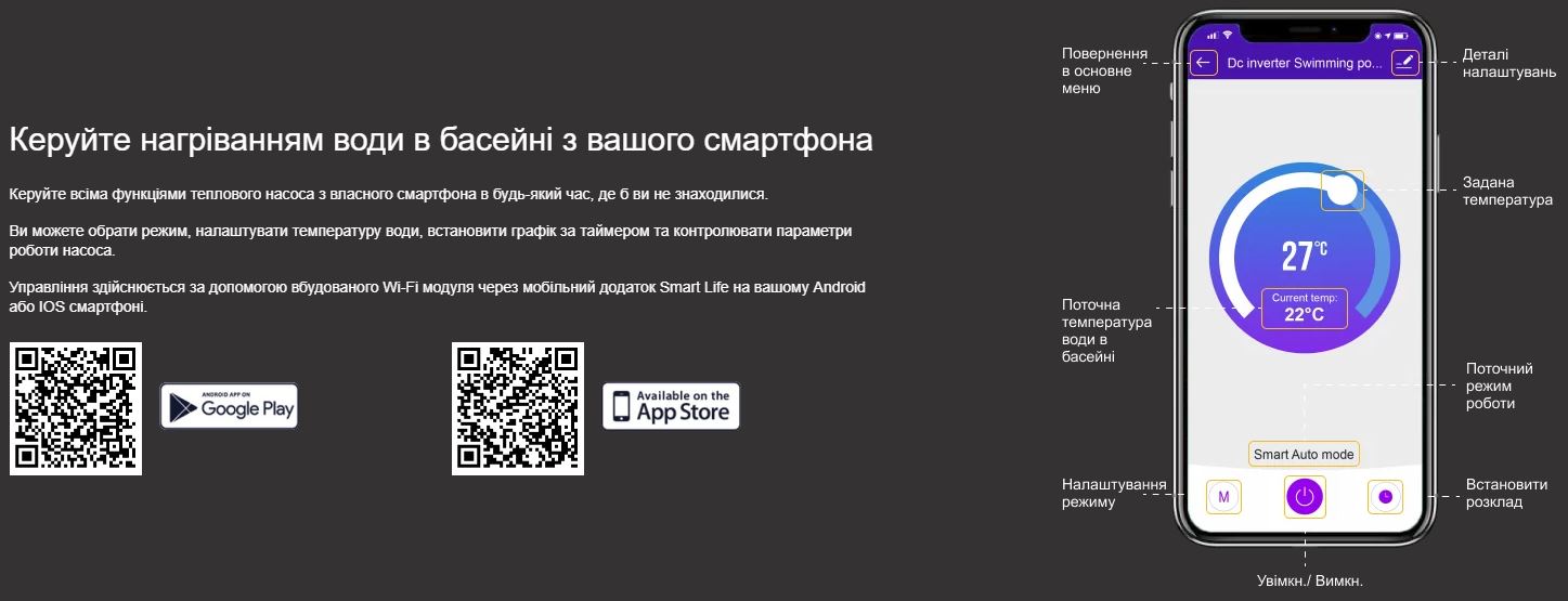 | Макс. об'єм басейну, м³ | до 65 м³ при температурі повітря 26°C |