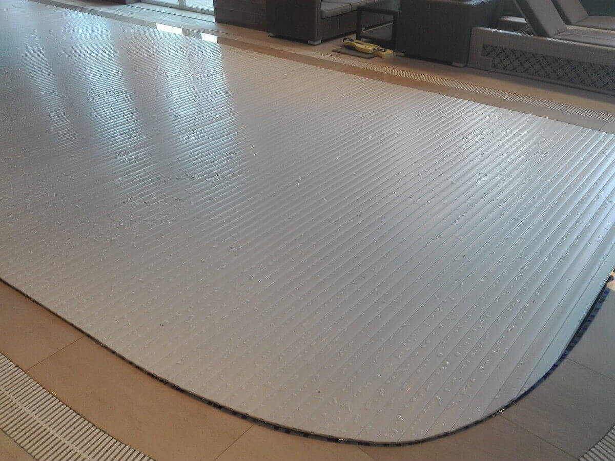 Просте рішення для нестандартної складної форми басейну. Ролетне покриття монтується в ніші на дні басейну і дозволяє створювати довільні форми, при цьому на одному пристрої знаходяться два покриття.