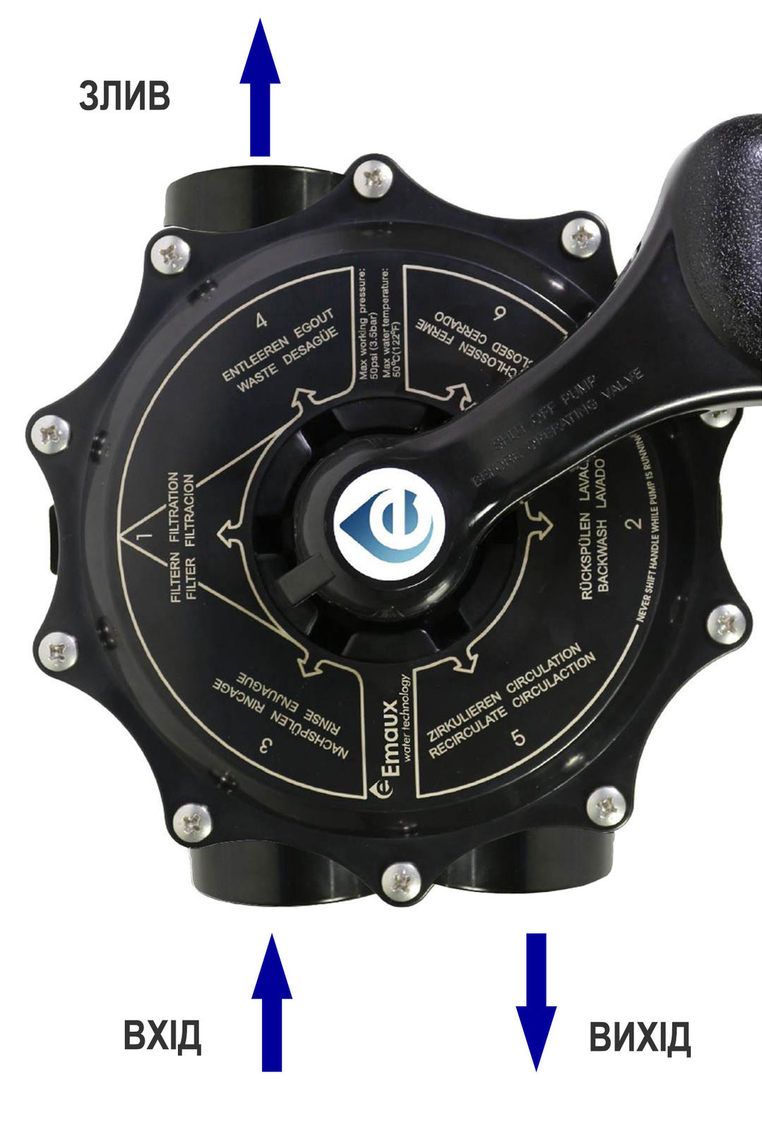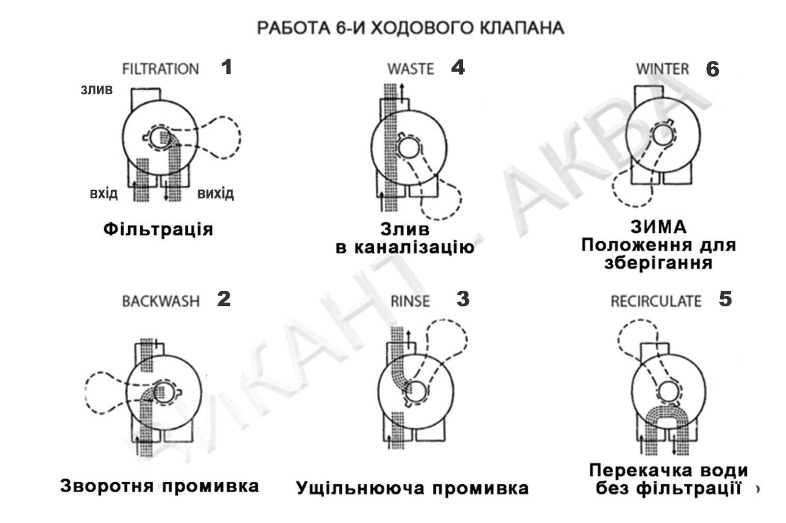ЗЛИВ У КАНАЛІЗАЦІЮ (WASTE). Вода з басейну забирається насосом фільтрувальної установки, минаючи фільтр, скидається в каналізацію. У режимі спорожнення ручка вентиля повинна знаходитися на № 4.