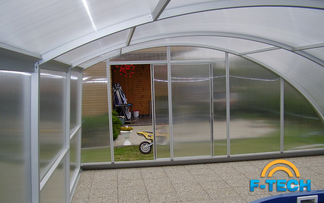 - передні і задні знімні чола з алюмінієвих профілів, які зовні покриті елоксом («elox» - електро-хімічна поверхнева обробка). Вони виповнені однокомірковими полікарбонатними листами з матовими відтінками. Листи на внутрішній стороні покриті шаром NO DROP, який істотно знижує конденсацію у вигляді крапель.