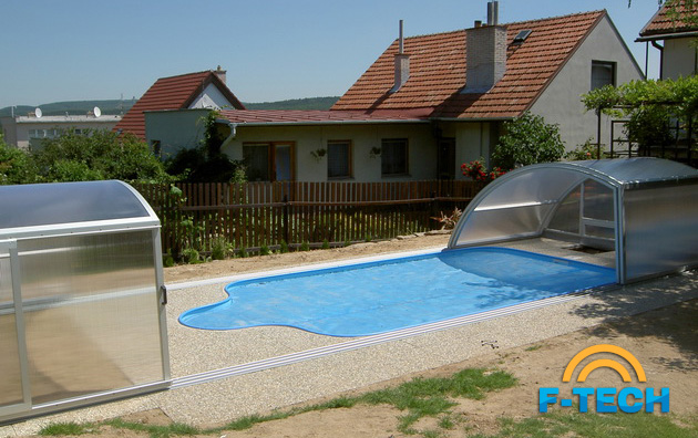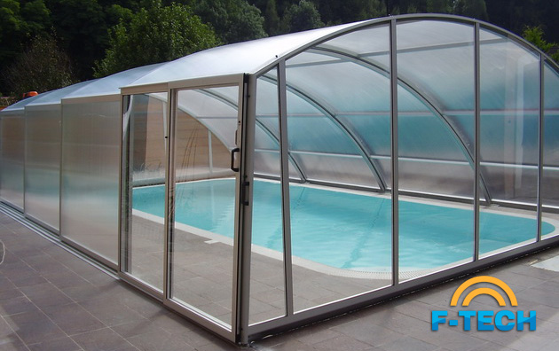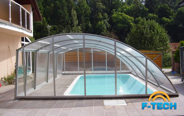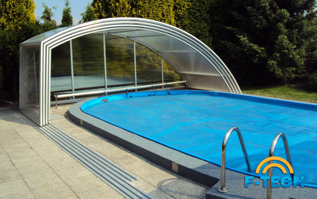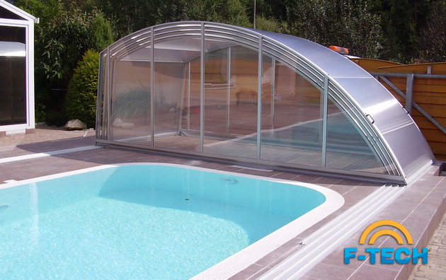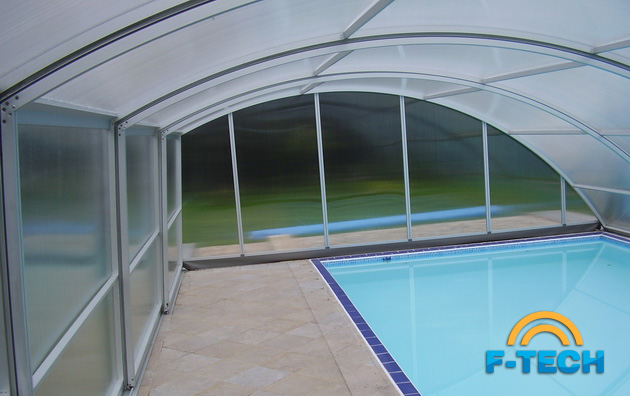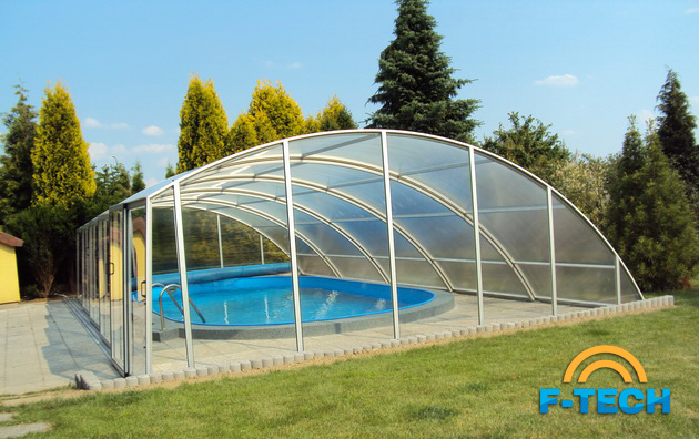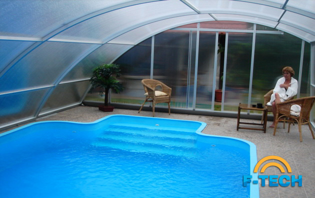 Дуговий павільйон з косою стіною - найбільш популярний і найбажаніша модель для покупців, які хочуть використовувати простір навколо басейна.