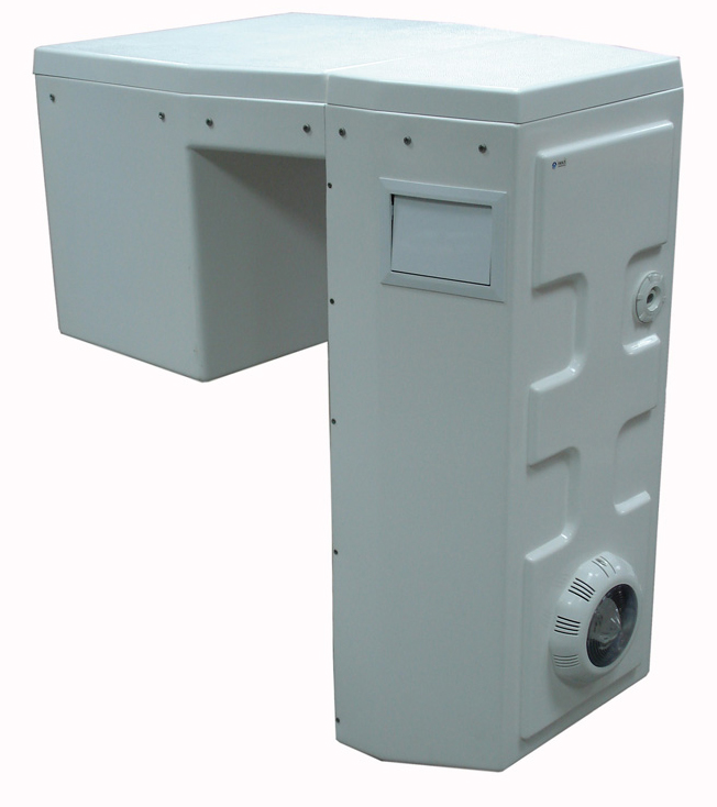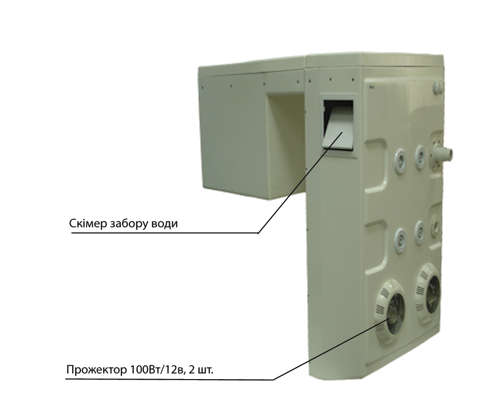 Передня частина — фронтальна частина, занурена в воду, складається з корпусу, в якому знаходяться прожектор, скіммер, фільтруюча кишеня, форсунки викидання води і труби для з’єднання.