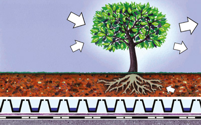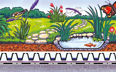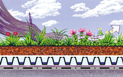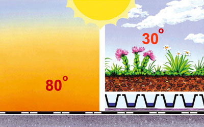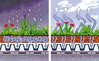 - Оскільки дощова вода використовується для живлення рослин, а також частково випаровується, зменшується навантаження на каналізацію