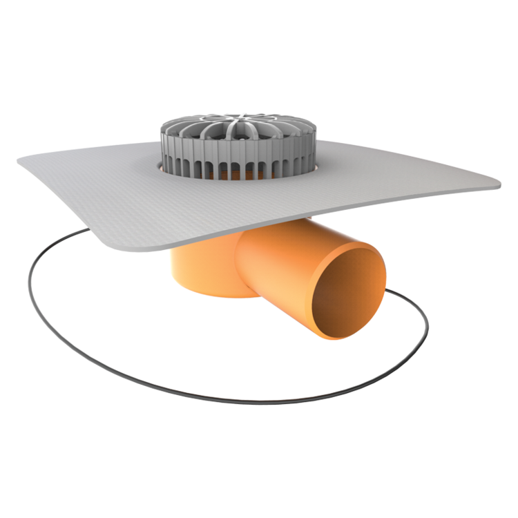 Терасна вирва TOPWET з привареним фартухом з ПВХ-мембрани, горизонтальне підключення, з електропідігрівом (напруга 230 В), з кабелем для підключення, з листовловлювачем